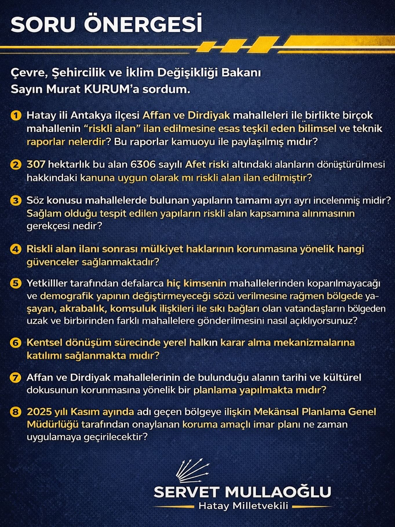 Milletvekili, Çevre, Şehircilik ve İklim Değişikliği Bakanı Murat Kurum’a yönelttiği sorularla riskli alan ilanının dayanağı ve sürecin şeffaflığı hakkında bilgi talep etti. Mullaoğlu, ilan edilen 307 hektarlık alanın 6306 sayılı Afet Riski Altındaki Alanların Dönüştürülmesi Hakkındaki Kanun’a uygun olup olmadığını, mahallelerdeki yapıların ayrı ayrı incelenip incelenmediğini, sağlam yapıların neden riskli alan kapsamına alındığını ve mülkiyet haklarının korunması için hangi güvencelerin sağlandığını sordu.